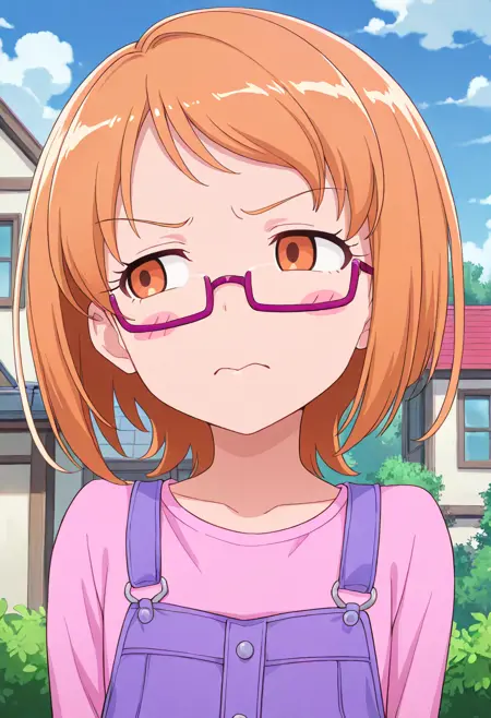 shirabe ako, casual, orange hair, brown hair, short hair, shiny hair, eyebrows visible through hair, eyelashes, under-rim eyewear, pink-framed eyewear, purple-framed eyewear, brown eyes, orange eyes, overalls, buttons, pink shirt, long sleeves, overall shorts, socks, pink legwear, sneakers, white footwear