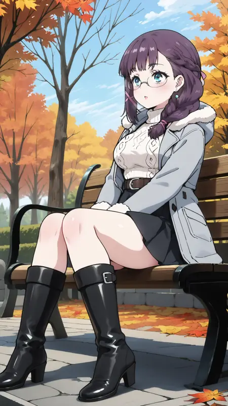 dark grey and white maid uniform, beret, dark grey beret, white feather, pink hairbands, glasses, thin-framed glasses, white front panel, black tie, puffed short sleeves, black armbands, white detached sleeves, brown shoulder straps, belt, brown belt, square buckle, silver buckle, Apron, white apron, dress, dark grey dress, high side slits, dark grey thigh highs boots,