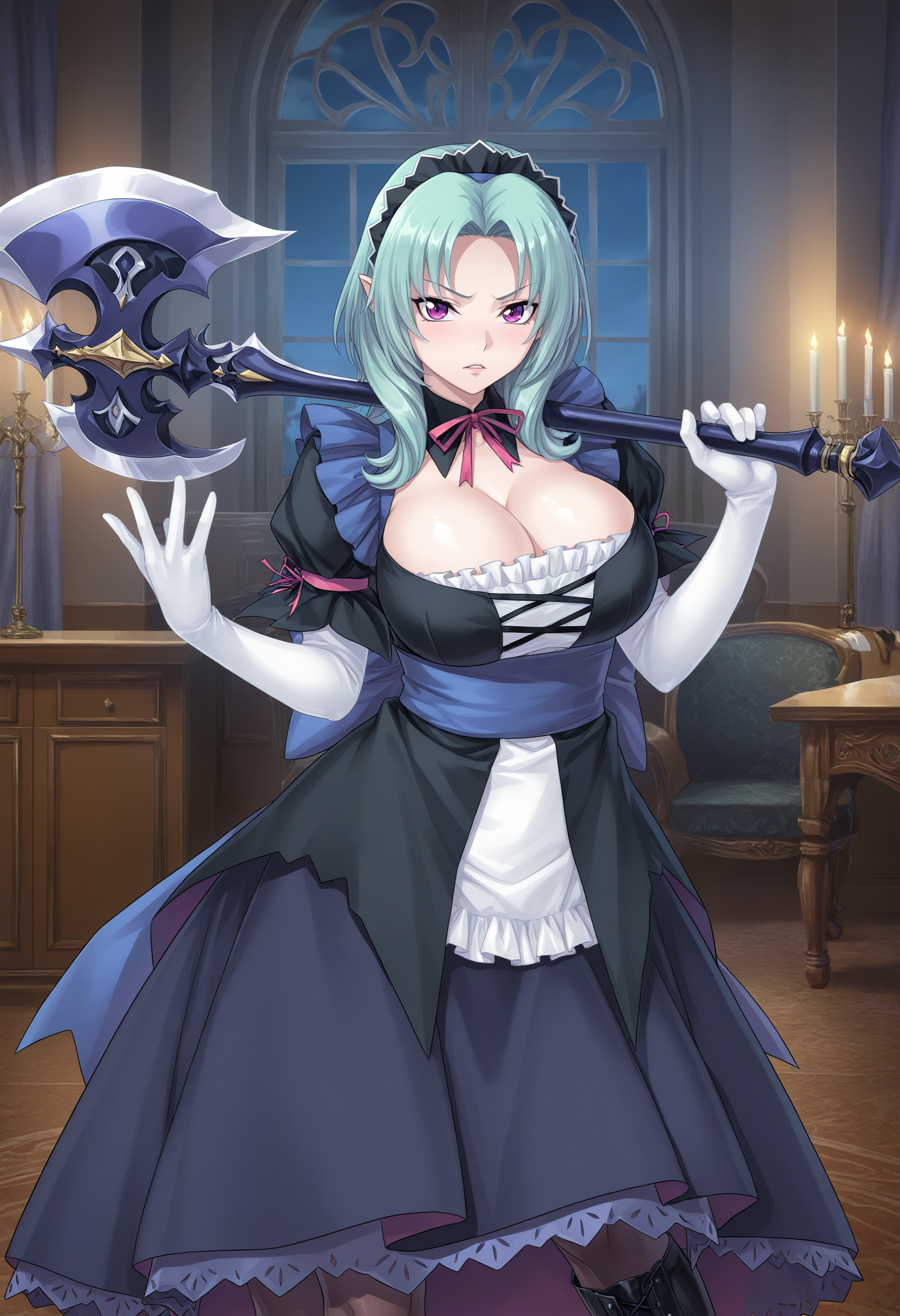 水蓝色头发, 长发, 紫色眼睛, 女仆头饰,