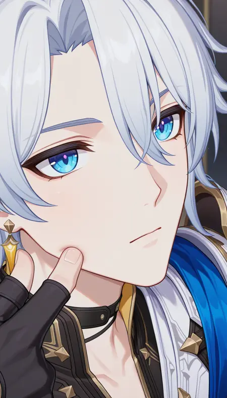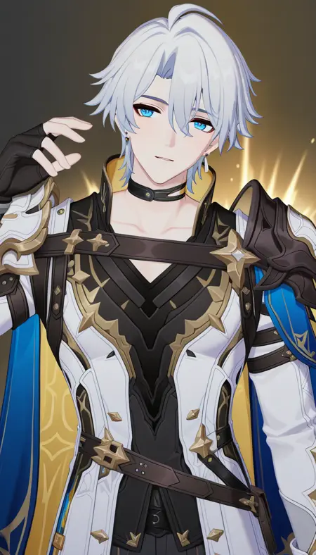 바이에, 파이논 \(혼카이: 스타레일\), 성인, 남성 중심, 1명의 남자아이, 파란 눈, 흰 머리, 검은 목걸이, 검은 부츠, 검은 장갑, 파란 망토, 코트, 귀걸이, 손가락 없는 장갑, 바지, 팔보호대, 한쪽 장갑, 흰 코트,