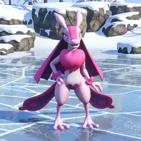 the pink creature, the creature has a heart shaped chest, the creature is very tall, her legs are long