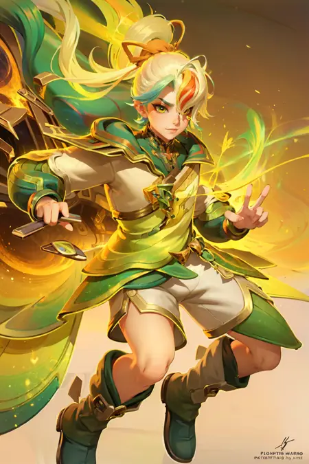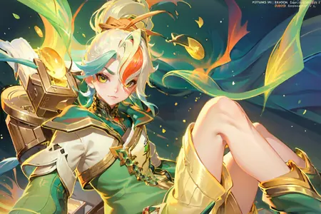 プロンプト: Yan_Auto_Archon, 1boy, solo, long hair, blonde hair, green hair, ponytail, multicolored hair, hair over one eye, earrings, male focus, green eyes, closed mouth, smile, cape, long sleeves, green sleeves, shorts, pants, white pants, boots, green footwear, portrait