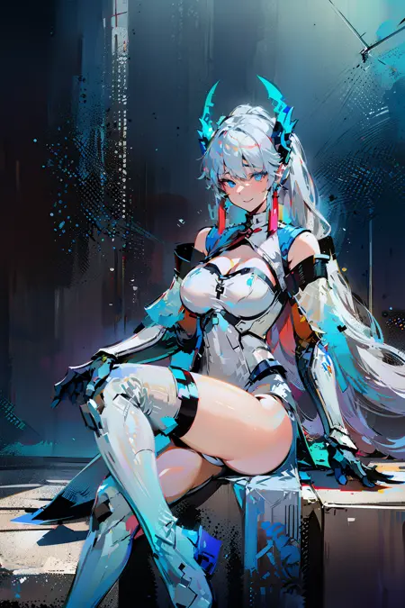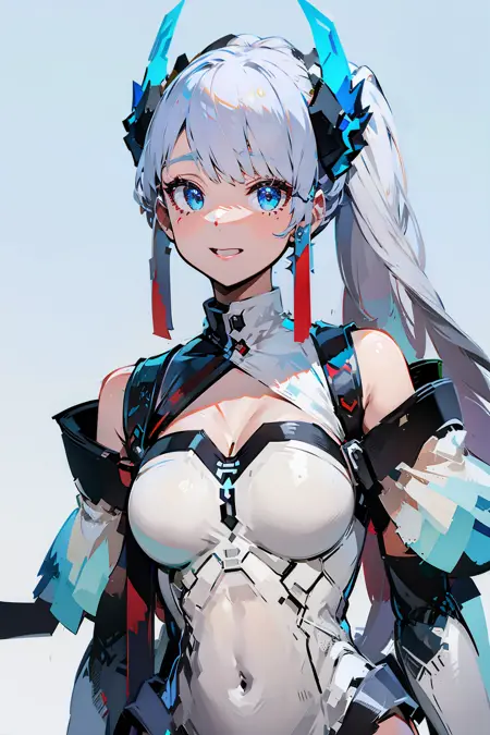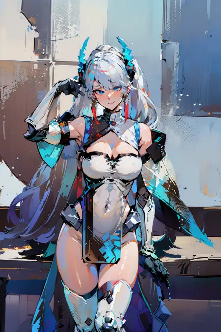 提示:, Airi_Heavenly_Striker, 1个女孩, 单人, 长发, 极长发, 白发, 多色发, 马尾, 刘海, 耳环, 看向观众, 蓝眼睛, 乳沟, 乳房, 中等乳房, 衣服露肤, 手套, 肚脐遮盖, 骨盆帘, 透明, 过膝袜, 白色过膝袜, 珠宝