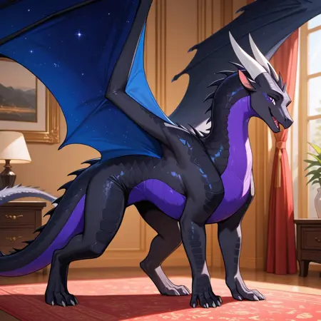 附加提示词:Nightwing_wof, dragon, claws, tail, starry wings, gray horns, black scales, blue underbelly, rounded snout, purple sclera, black slit pupils, 1girl