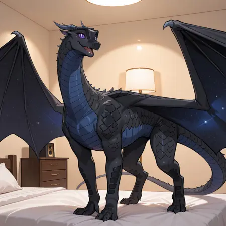 追加プロンプト:Nightwing_wof, dragon, claws, tail, starry wings, gray horns, black scales, blue underbelly, rounded snout, purple sclera, black slit pupils, 1girl