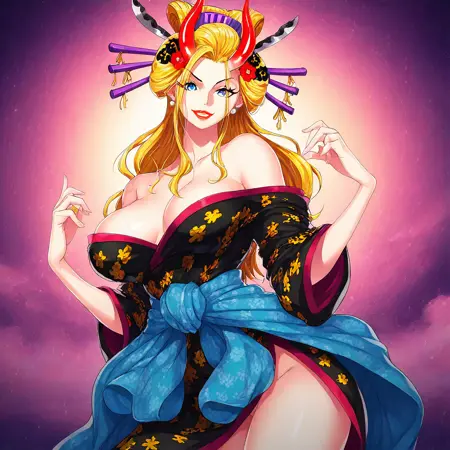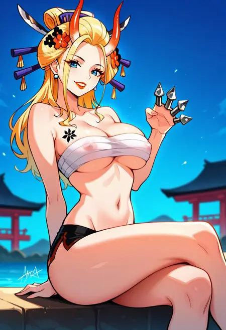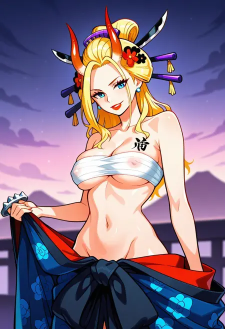 BlackMariaOP, 1girl, solo, well-proportioned woman, giantess, long hair, blonde hair, geisha hair styled, hair ornament, hair stick, hair flower, sky blue eyes, pair red horns, lips, lipstick, large breast, eyelashes, makeup, kanzashi, collarbone, bare shoulders, earrings, cleavage, taking off kimono, sarashi on breast, navel, midriff, groin, topless, tattooed on her back, kanji tattoo, brass knuckles,