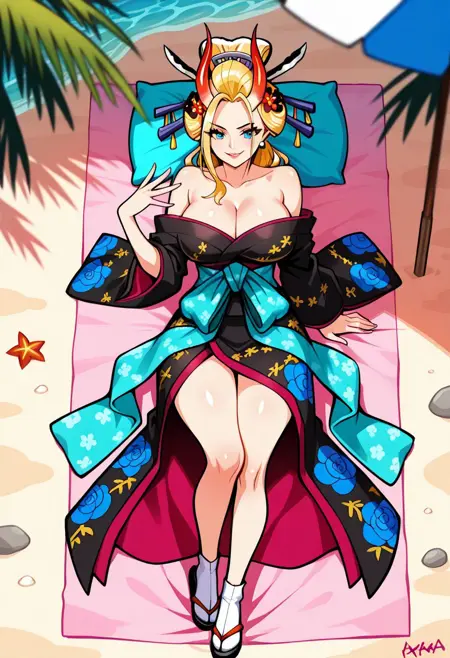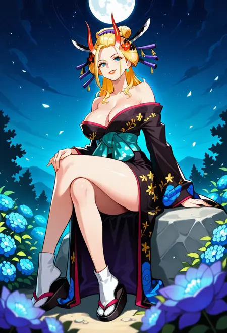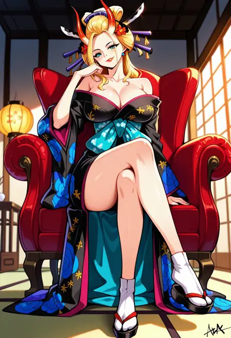 BlackMariaOP, 1girl, solo, well-proportioned woman, giantess, long hair, blonde hair, geisha hair styled, hair ornament, hair stick, hair flower, sky blue eyes, pair red horns, lips, lipstick, large breast, eyelashes, makeup, kanzashi, collarbone, bare shoulders, earrings, cleavage, japanese clothes, low-cut black kimono, turquoise obi around her waist, blue and yellow floral patterns, black shoes, tabi, wide sleeves, sash, smoking pipe, kiseru, shamisen,