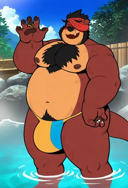 Anthro, furry, Otter, Maroon Fur, Red Cloth Eye Patch, Overweight, Hairy Chest, Armpit Hair, Black Hair, Spikey Hair, Black sideburns, black horns, blue eye, 1eye, 1fang, five fingers, five toes, webbed toes, otter tail