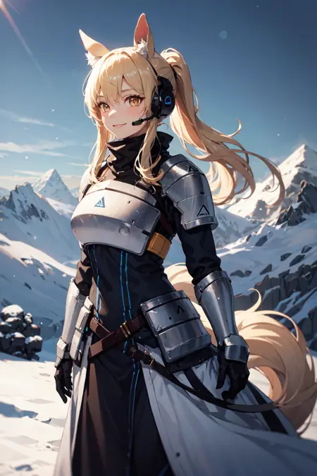 nearl, 1girl, solo, blonde hair, yellow eyes, animal ears, horse ears, horse girl, shoulder armor, ponytail, black dress, breastplate, headset,