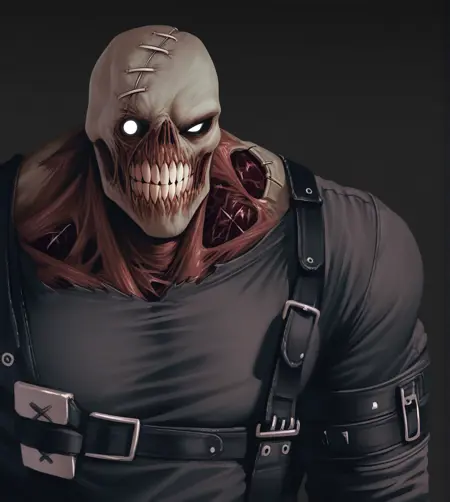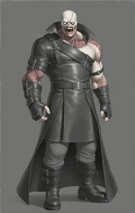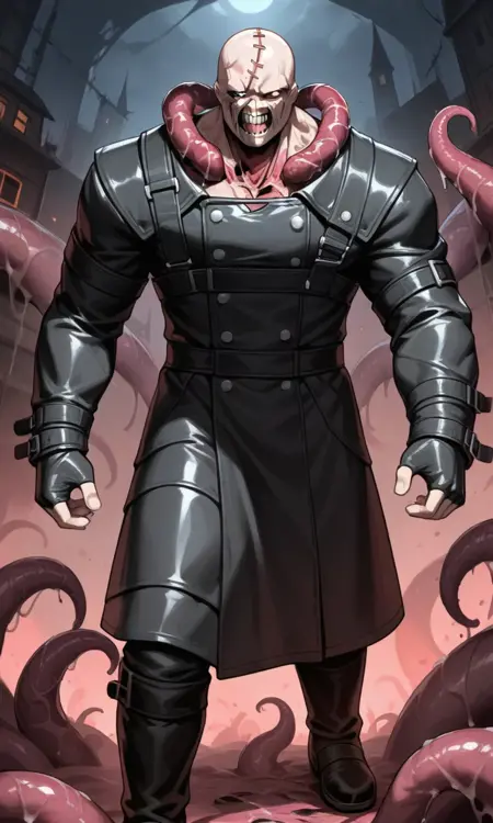 プロンプト:NemesisRE3、ブラックブーツ、バックルとストラップ付きの長い黒いレザーコート、ストラップ付きの手甲、縫い目のある肌、露出した歯、肉質、首周りの触手、ゾンビ、ハゲ、男性、縫い目、筋肉