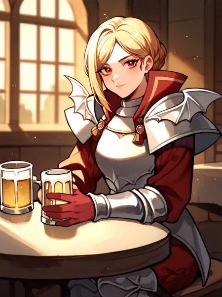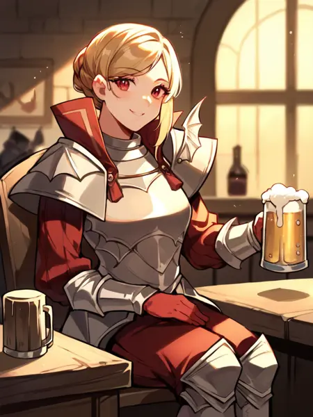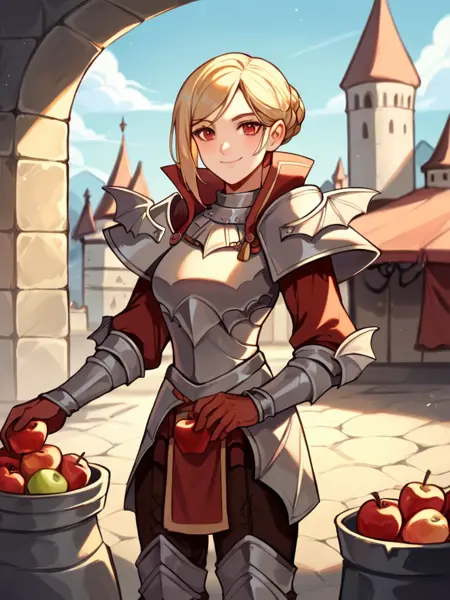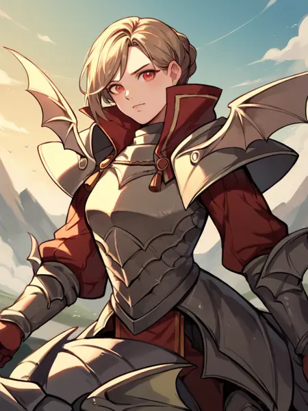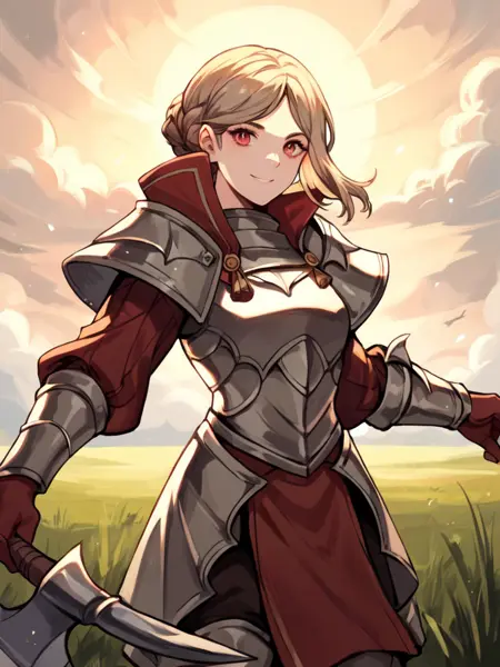 Prompt: LadislavaFE, light brown hair, short hair, single hair bun, pink eyes, LadislavaArmor, armor, breastplate, gloves, shoulder armor, greaves, red gloves, pauldrons, boots