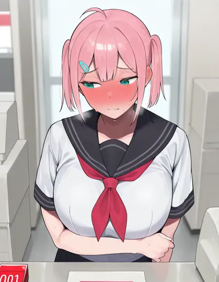 sakurai_hana,1girl,twintails,blue hairclip,pink hair,ahoge,blue eyes