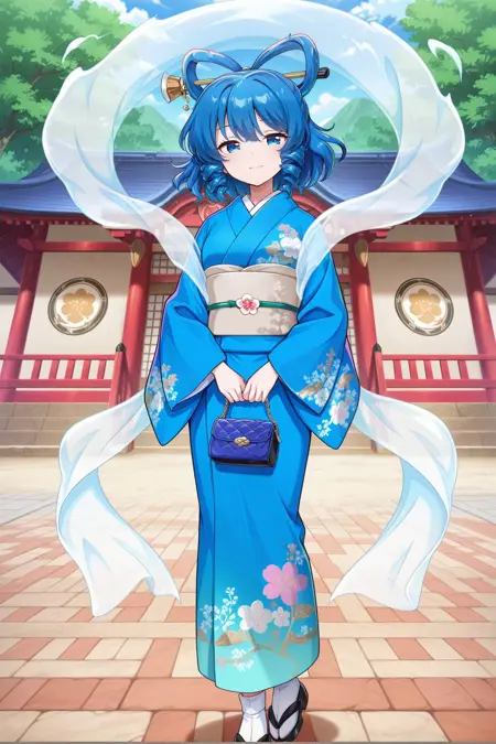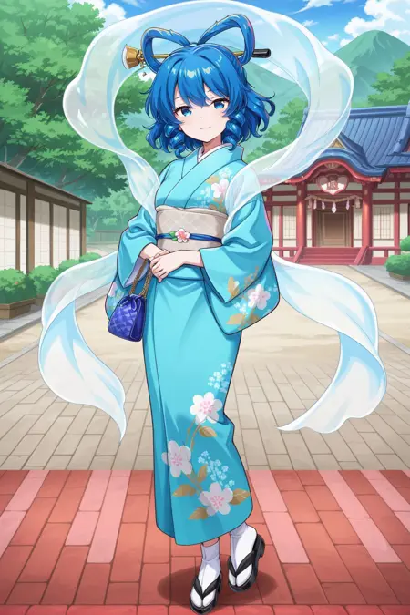 kaku seiga, 1girl, solo, blue eyes, blue hair, hair rings, drill sidelocks, kaku seiga \(social club mother\), alternate costume, hair ornament, hair stick, hagoromo, see-through shawl, blue kimono, print kimono, floral print, long sleeves, wide sleeves, grey obi, blue obijime, grey obiage, white socks, tabi, geta, black sandals, handbag, blue bag,