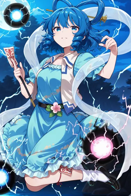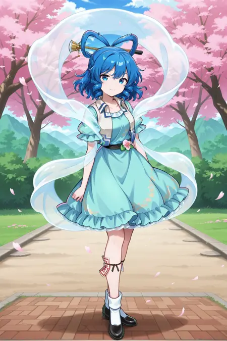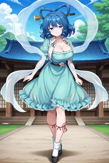 kaku seiga, 1girl, solo, blue eyes, blue hair, hair rings, drill sidelocks, large breasts,, kaku seiga \(desires\), adapted costume, hair ornament, hair stick, hagoromo, white shawl, white vest, open vest, clevage, cyan dress, frilled dress, short sleeves, floral print dress, black belt, red leg ribbon, ofuda, white socks, black shoes,