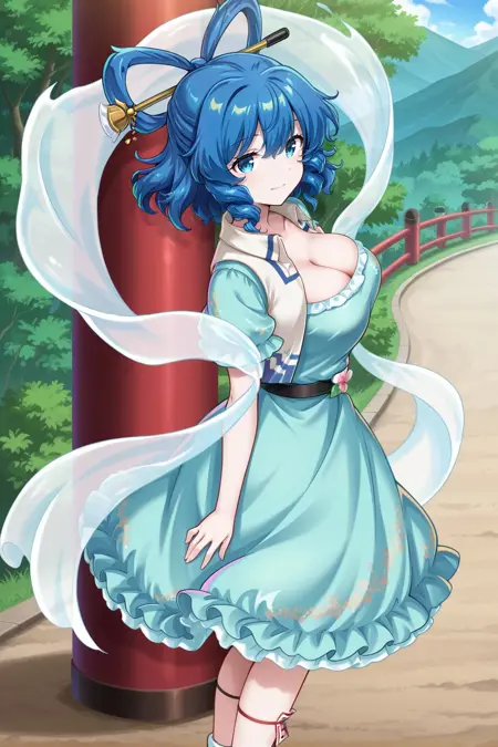 kaku seiga, 1girl, solo, blue hair, blue eyes, short hair, medium breasts, hair rings, hair stick,