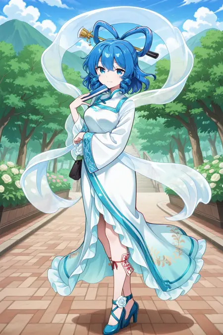 kaku seiga, 1girl, solo, blue eyes, blue hair, hair rings, drill sidelocks,