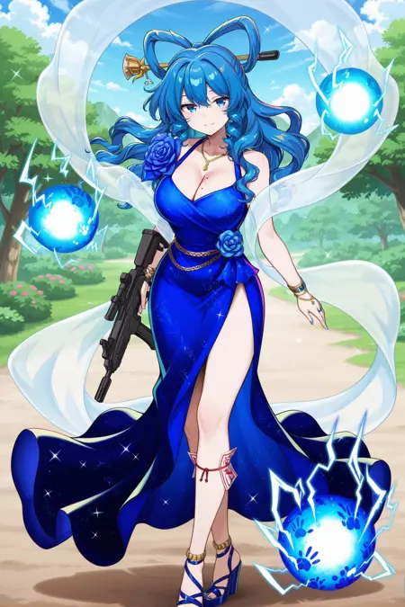 kaku seiga, 1girl, solo, blue eyes, blue hair, long hair, drill hair, drill sidelocks, hair rings, large breasts, mole on breast,, kaku seiga \(undying tolerance for spirits\), alternate costume, hair ornament, hair stick, gold necklace, pendant, hagoromo, see-through shawl, single bare shoulder, blue corsage, flower on shoulder, cleavage, blue dress, long dress, print dress, starry sky print, sleeveless dress, gold bracelet, blue ring, chain belt, side slit, bare legs, gold leg chain, ofuda, blue shoes, platform heels, holding uzi, holding gun,