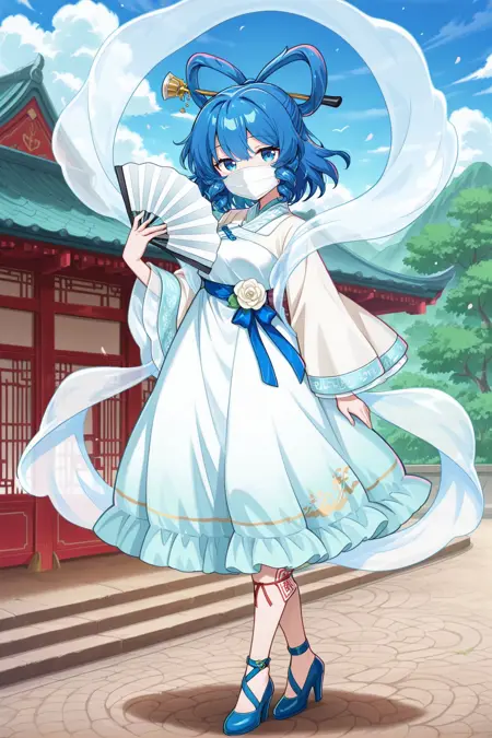 kaku seiga, 1girl, solo, blue eyes, blue hair, hair rings, drill sidelocks, kaku seiga \(optimistic white hermit\), alternate costume, white veil, see-through veil, mouth mask, hair ornament, hair stick, hagoromo, see-through shawl, china dress, gradient dress, white dress, blue dress, hanfu, aoqun, long sleeves, wide sleeves, blue shoes, high heels, red leg ribbon, ofuda, folding fan, holding fan, holding white rose,