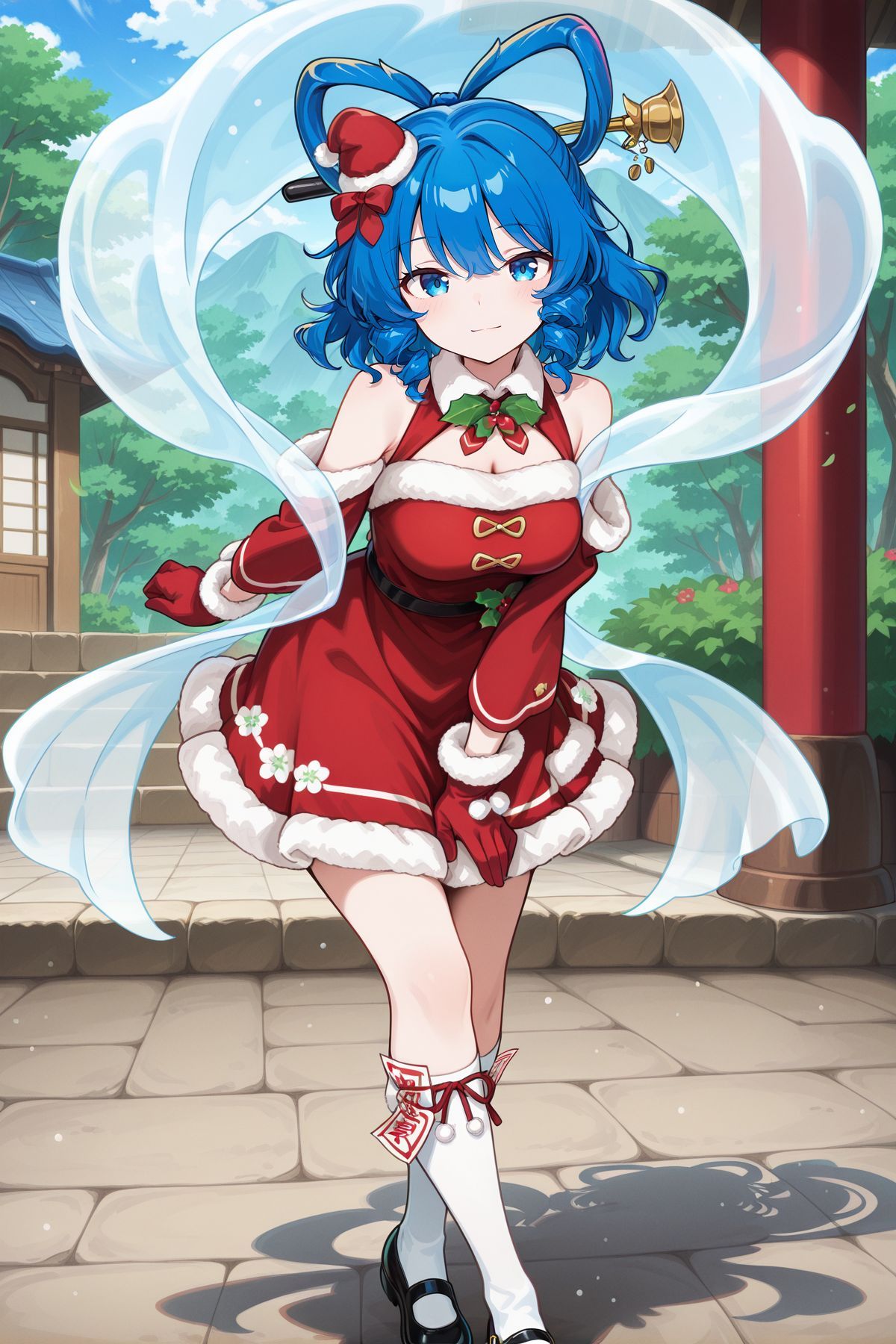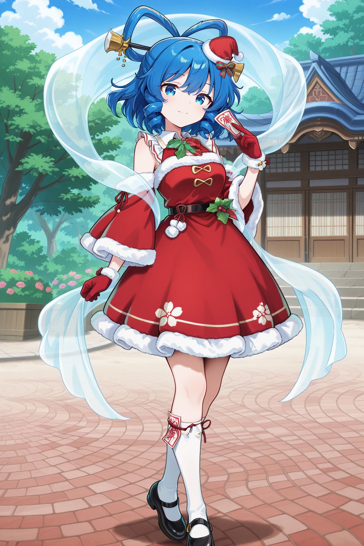 kaku seiga, 1girl, solo, blue eyes, blue hair, hair rings, drill sidelocks, kaku seiga \(no chimney no problem\), alternate costume, mini santa hat, red hat, mini hat, hair ornament, hair bell, gold hair stick, blue hagoromo, see-trough shawl, red bowtie, holly pendant, red dress, fur-trimmed dress, long sleeves, detached sleeves, fur-trimmed sleeves, red gloves, fur-trimmed gloves, kneehighs, white socks, mary janes, black shoes, ofuda,