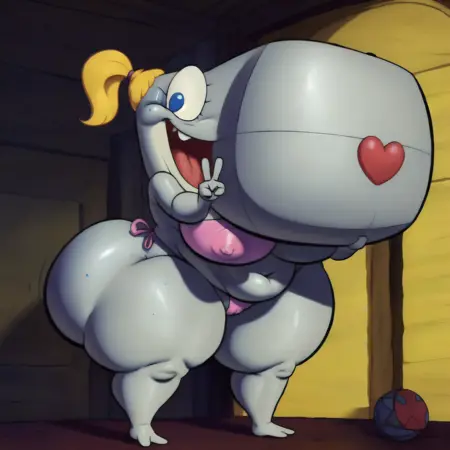 卡通角色,珍珠·蟹,灰色皮肤,鲸鱼,金色马尾辫配粉色发圈,鼻底有红色心形图案,实心蓝色椭圆形眼睛,六根睫毛,颈部有五条腹褶,粉红色啦啦队上衣,深品红色裙子,带有字母P设计,白色靴子。
