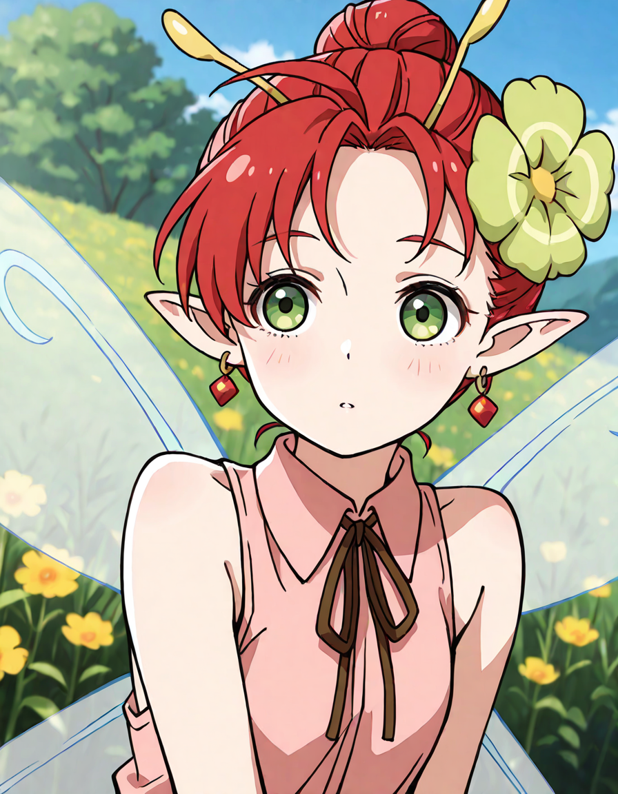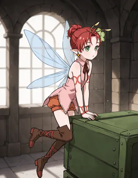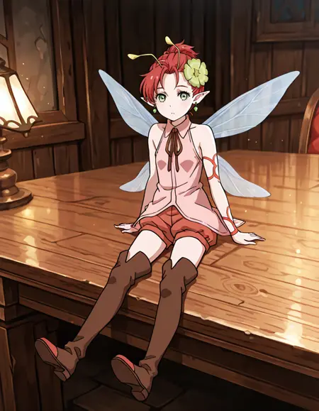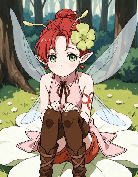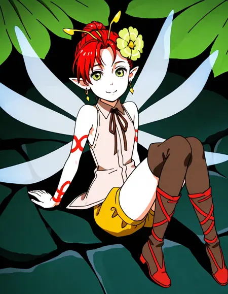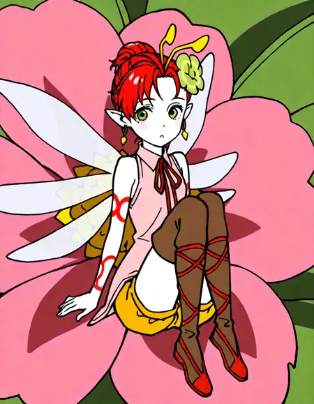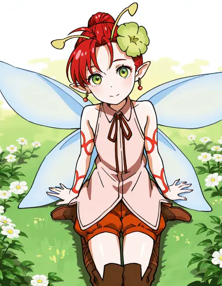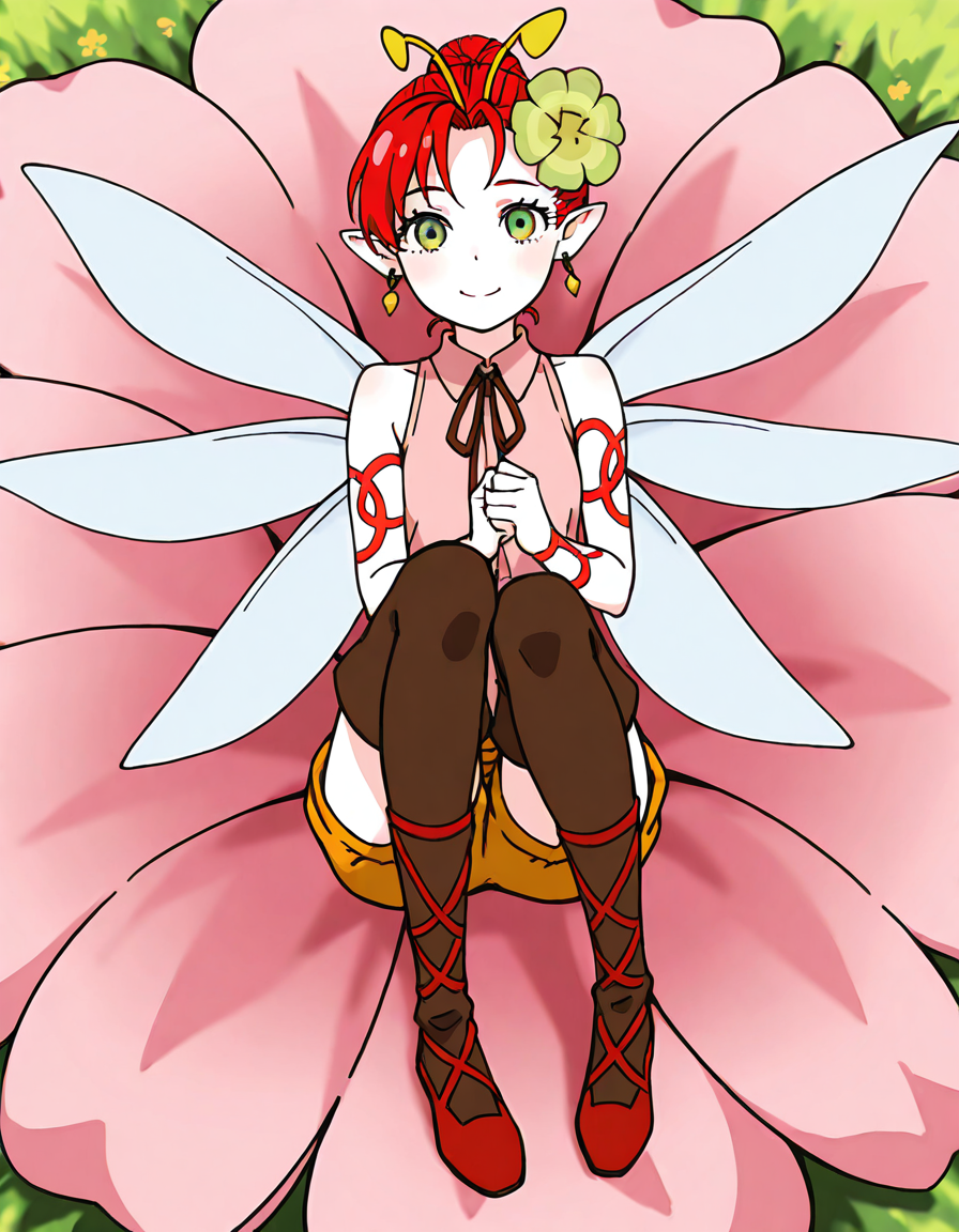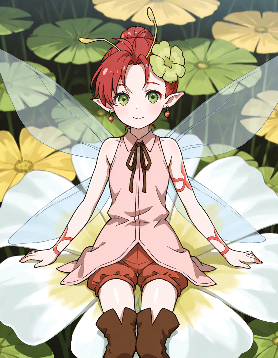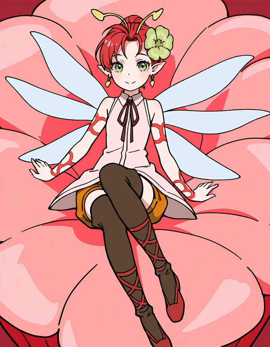 1girl, solo, short hair, red hair, green eyes, pointy ears, hair ornament, flower, earrings, jewelry, shorts, sleeveless, boots, thigh boots, ribbon, antennae, wings, fairy wings, fairy, tattoo, minigirl,