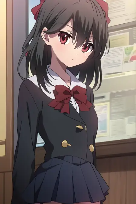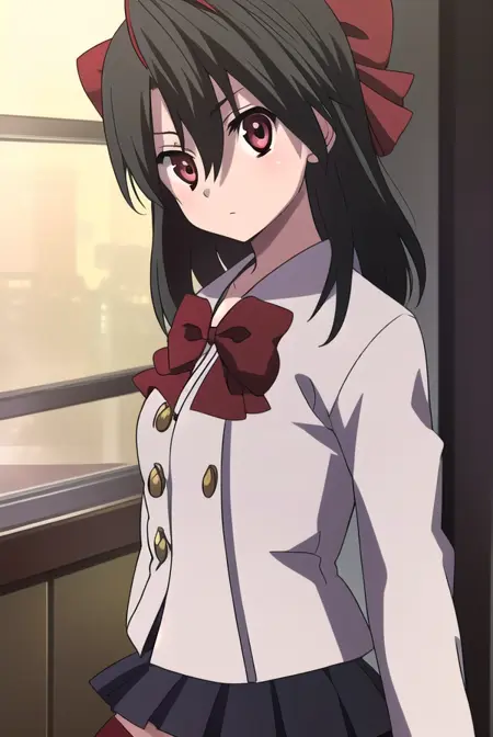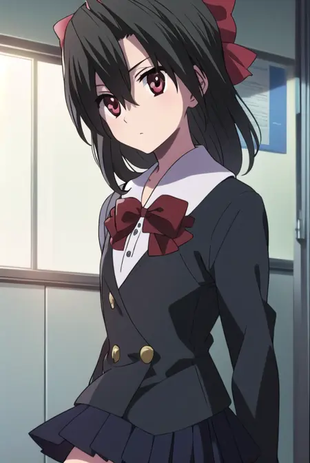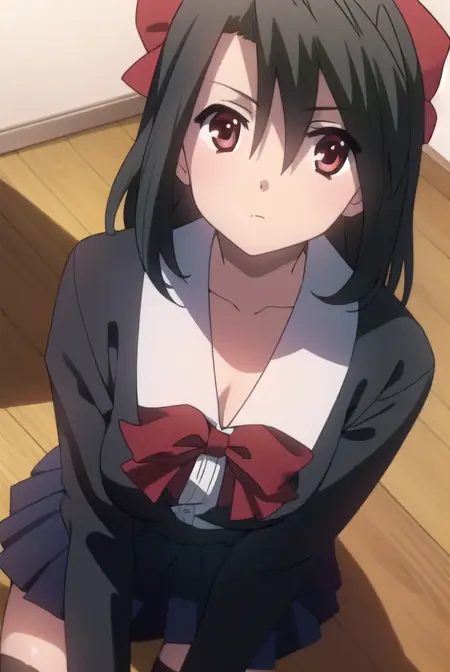 setsuna kiyoura, 검은 머리, (빨간 눈:1.5), 머리 리본, 빨간 리본,