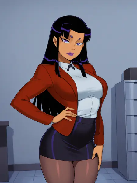 사무실 복장- 빨간 재킷, 정장, 흰 셔츠, 스커트, 연필 스커트, 갈색 스타킹