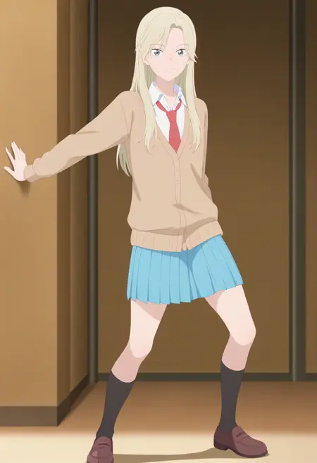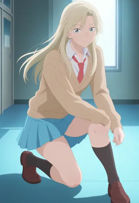 skirt, shirt, long sleeves, school uniform, white shirt, pleated skirt, necktie, shoes, socks, collared shirt, blue skirt, kneehighs, brown footwear, cardigan, red necktie, black socks, loafers