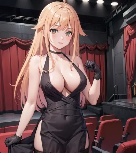 드레스: 항공우주 색안경, 머리에 안경, 검은 드레스, 볼륨 있는 가슴, 검은 무릎까지 오는 양말, 콧줄, 장갑