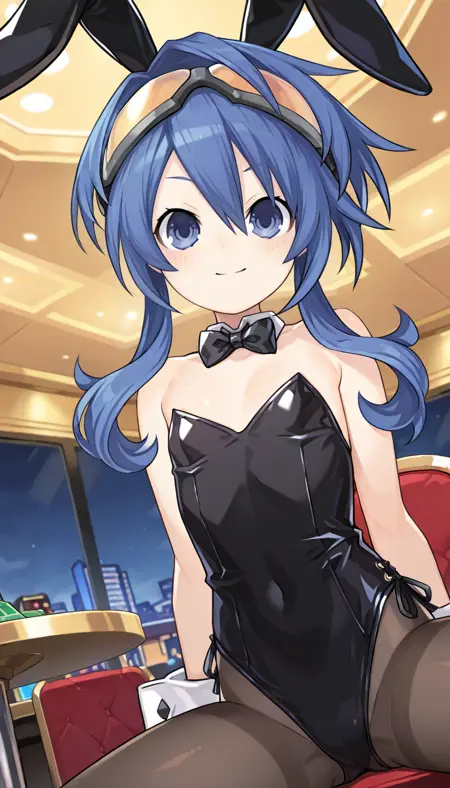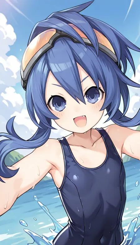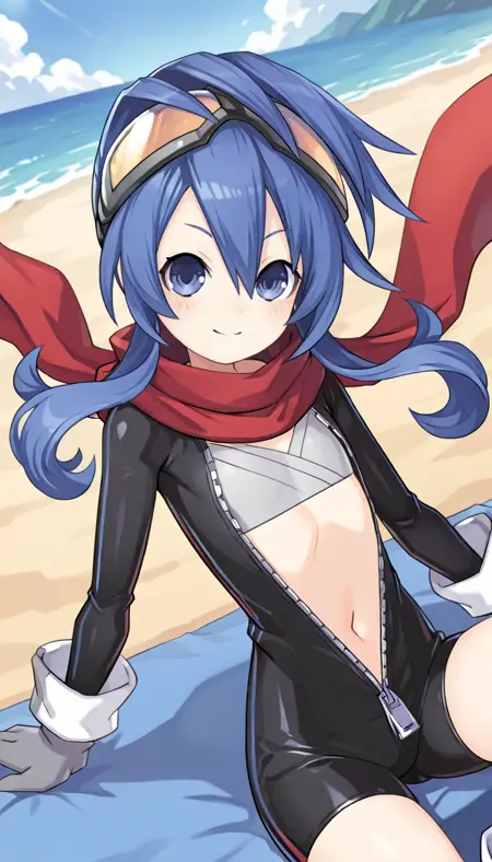 外見: ニサ \(neptunia)\、青い髪、青い目、長い前髪のある短髪、頭にゴーグル、髪がゴーグルを覆う、平らな胸、若い女の子