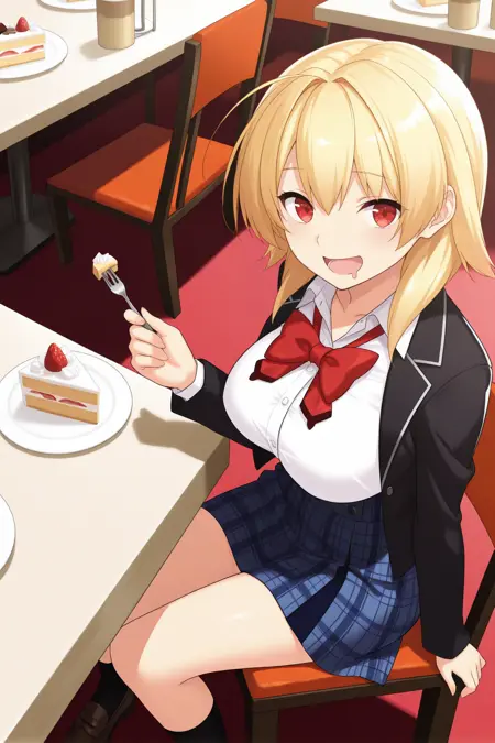 Add "red bowtie, white shirt, collared shirt, black blazer, plaid skirt, high-waist skirt, blue skirt, black socks, loafers" for her casual outfit.