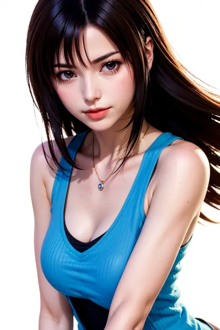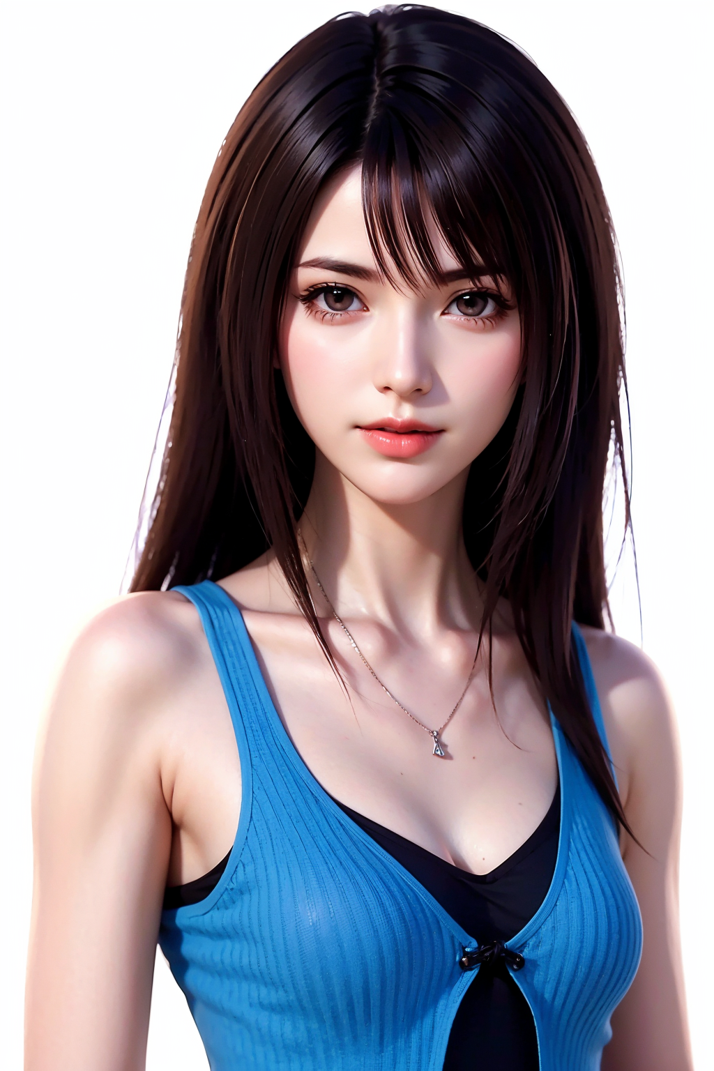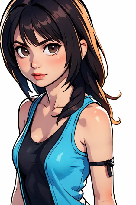 正面提示: 女性,莉诺娅,长发,棕色头发,棕色眼睛,蓝色无袖连衣裙,黑色背心,手臂丝带
