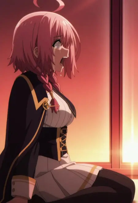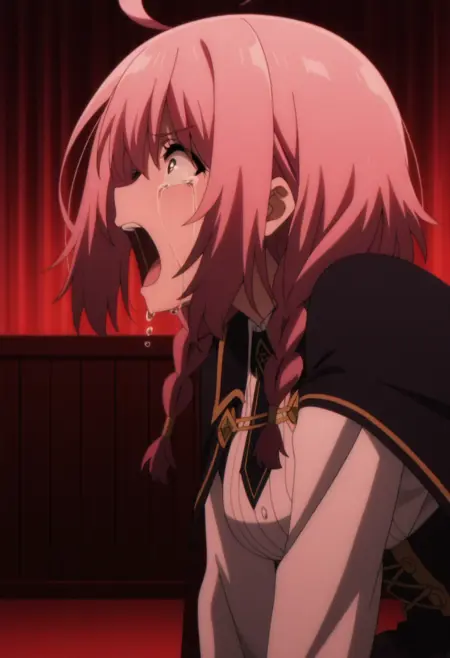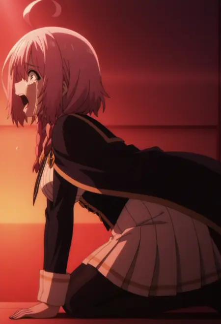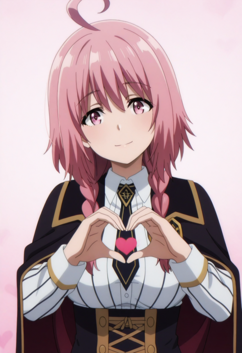 1girl, sherry barnett, pink hair, ahoge, twin braids,