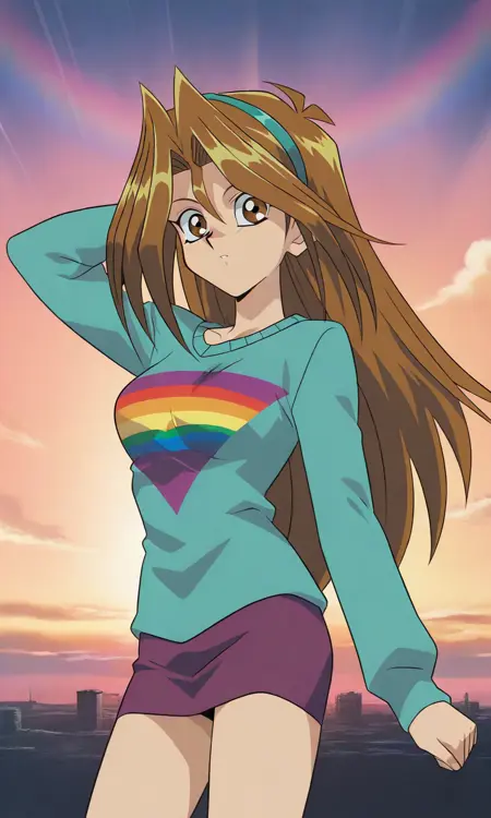 1girl, ahoge,brown hair,brown eyes, long hair, aqua hairband, aqua sweater, long sleeves, print shirt, purple skirt, short skirt