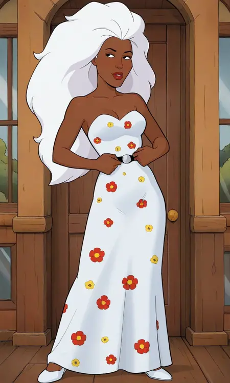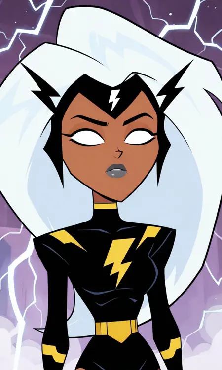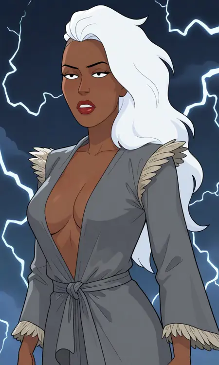 1girl, storm(marvel), white hair, very dark skin, long hair, big hair, black cape, black capelet, Yellow trim, black leotard, blank eyes, white eyes, no pupils, black headpiece, red gemstone, red lips