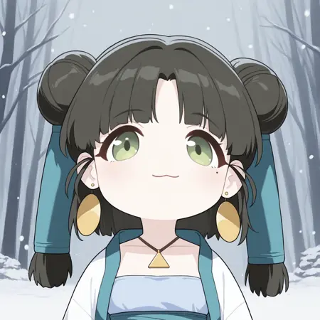 검은 머리, 녹색 눈, 눈 밑 점, 더블 번, 머리 관, 노란 귀걸이, 노란 목걸이,