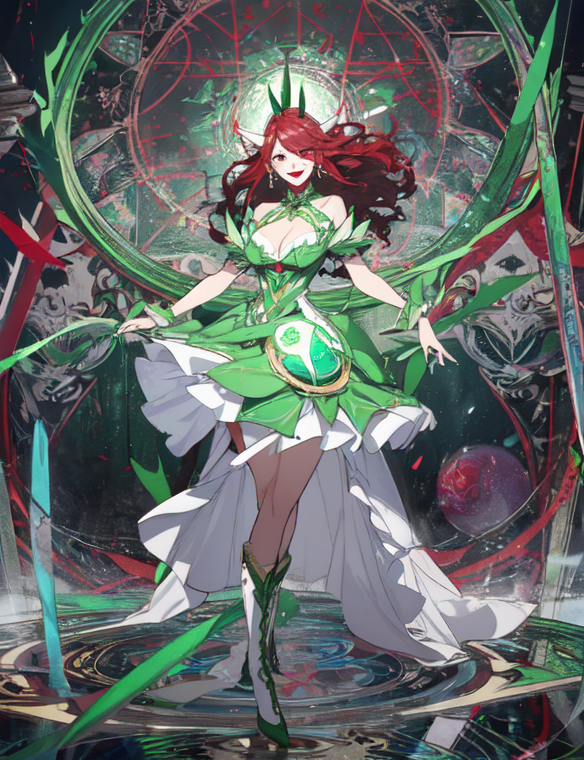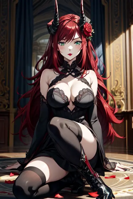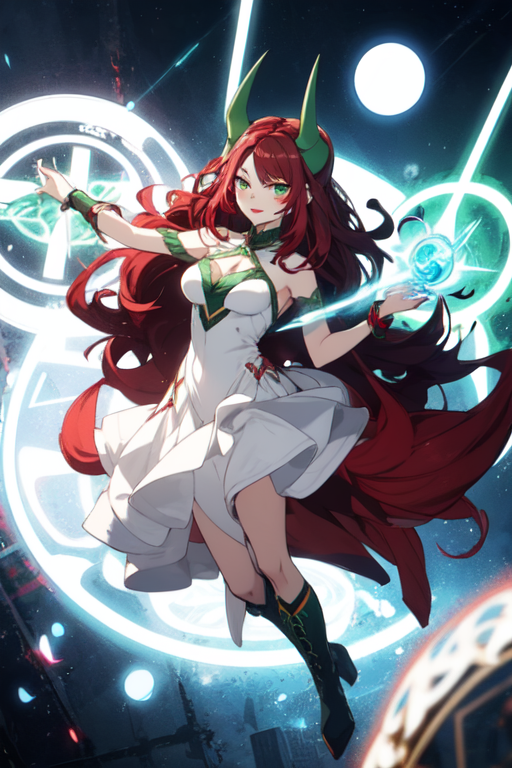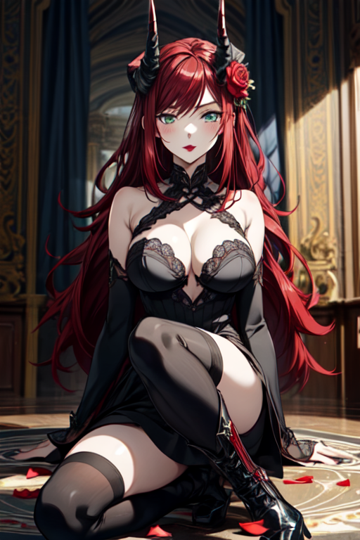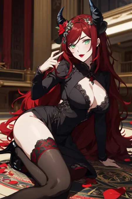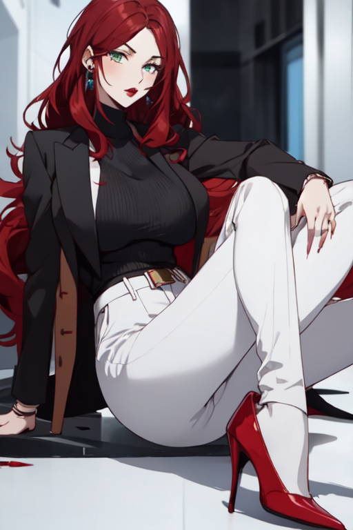 sophie_1, red hair, long hair, green eyes, medium breasts, large breasts, lipstick, red lips, suit, jacket, turtleneck, black jacket, white pants, high heels red footwear, jewelry