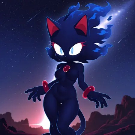 その他のタグ: 赤い胸元の宝石, 猫科, 猫, 1girl, 火焰の体, 光る目, 青い輪郭, 火焰, 尾, 火炎, 青い目, 口なし, 赤いブレスレット