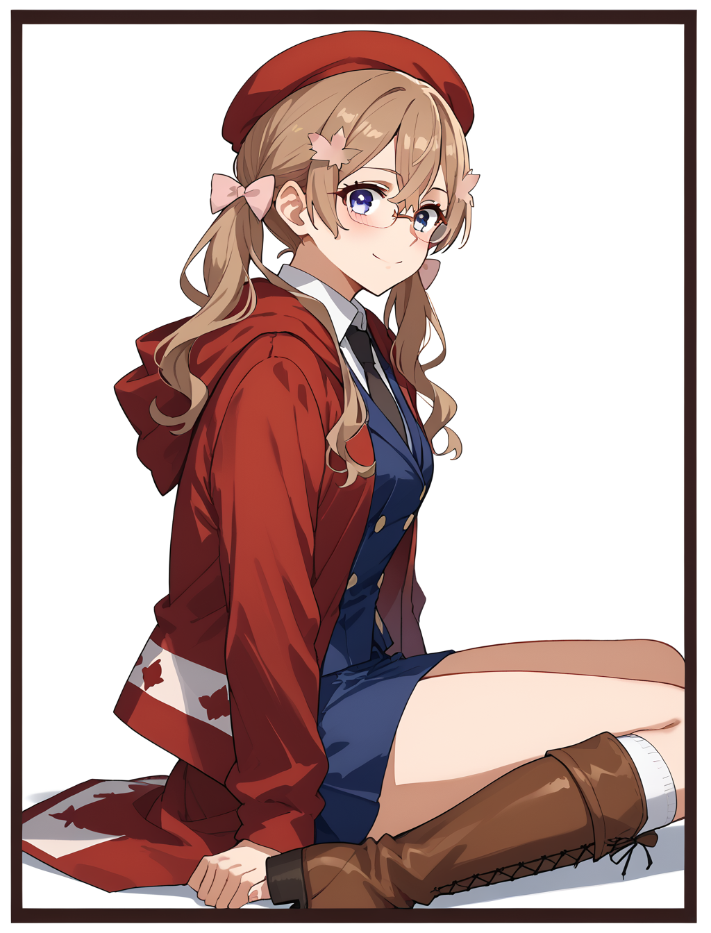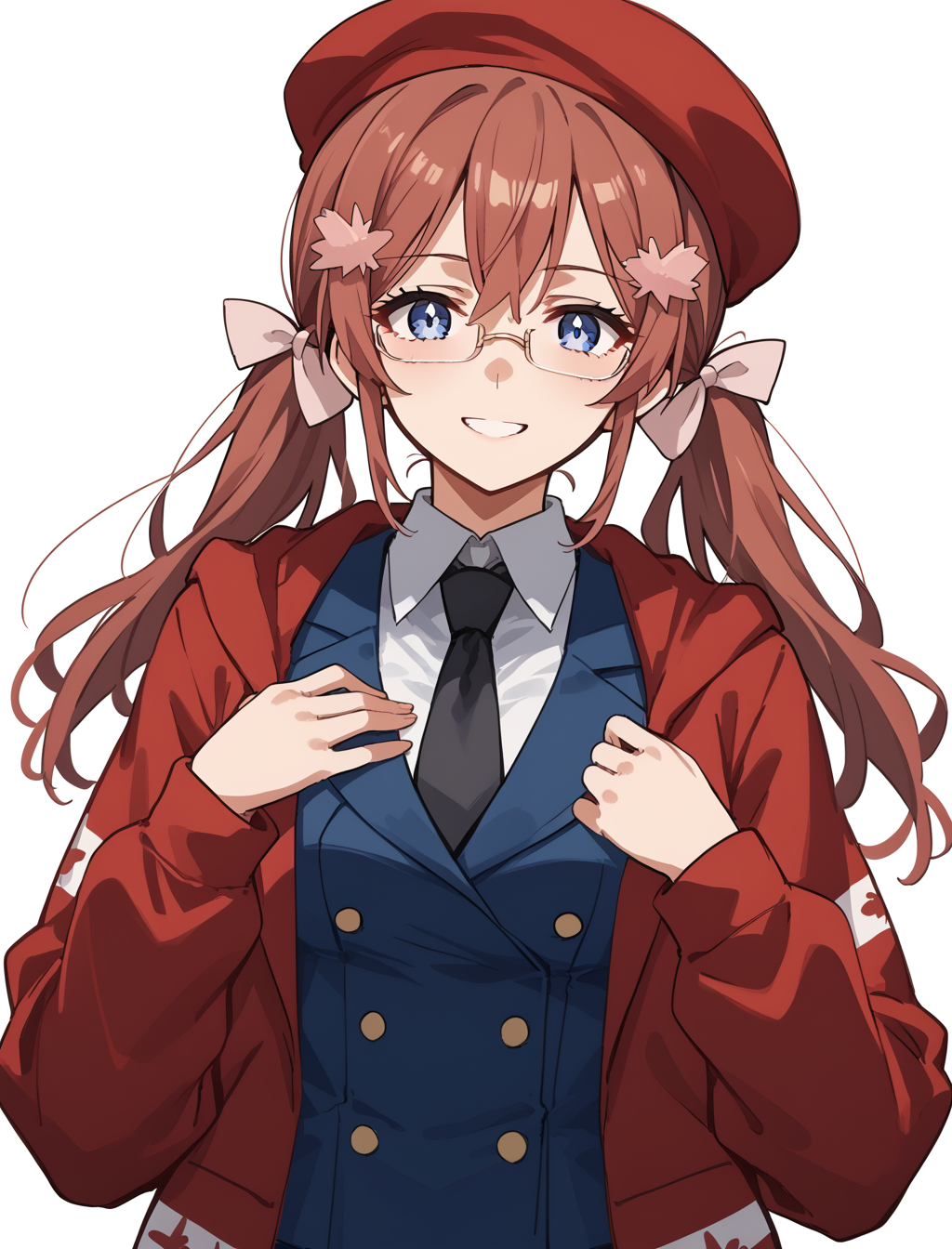 hat, hairclip, hair bow, glasses, red jacket, blue vest, white shirt, necktie, blue skirt