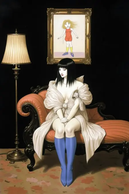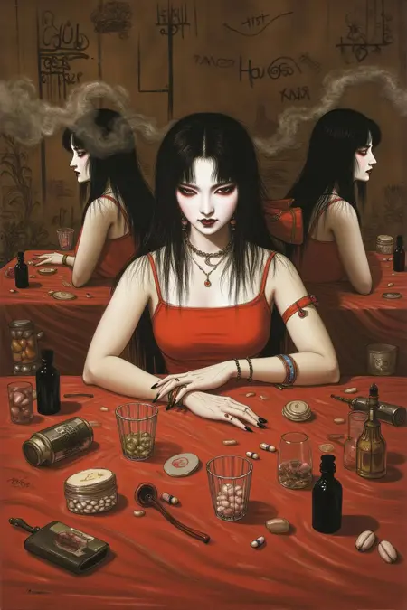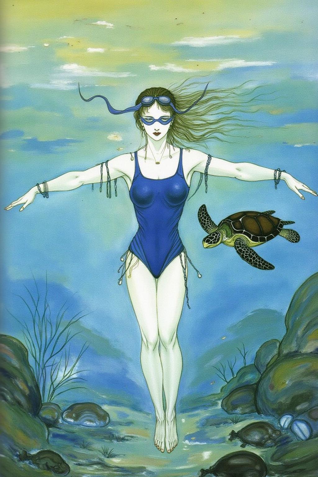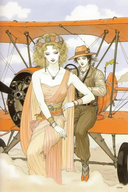 天野喜孝(1952年生まれ)は、ファンタジー芸術、アニメ、ビデオゲームの分野で知られる日本のアーティスト、イラストレーター、キャラクターデザイナーです。彼の作品は、伝統的な日本画、アルト・ヌーボー、西洋ファンタジーの影響を融合させた、空虚で夢幻的なスタイルで有名です。代表作には、『ファイナルファンタジー』シリーズのキャラクターデザイン、『ヴァンパイア・ハンターD』、多数の插画本や絵画が含まれます。天野の芸術は、繊細な線、鮮やかな色彩、神秘的な雰囲気で称賛されています。