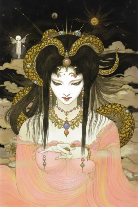 天野喜孝氏が生み出した美しいファンタジー插画にインスパイアされて。天野喜孝は、国際的に著名な日本のビジュアルアーティストで、キャラクターデザイナー、イラストレーター、舞台・映画の舞台美術・衣装デザイナーでもあります。彼の作品をご覧になりたい方は、以下のリンクをご利用ください: