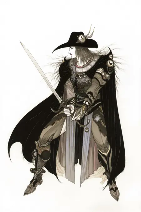 天野喜孝(Yoshitaka Amano,生于1952年)是一位日本艺术家、插画师和角色设计师,以在奇幻艺术、动漫和电子游戏领域的作品而闻名。他因空灵梦幻的风格而著称,融合了传统日本艺术、新艺术运动与西方奇幻元素。其标志性作品包括《最终幻想》系列的角色设计、《吸血鬼猎人D》以及大量插图书籍与画作。天野的艺术以细腻线条、鲜艳色彩和神秘氛围而备受赞誉。