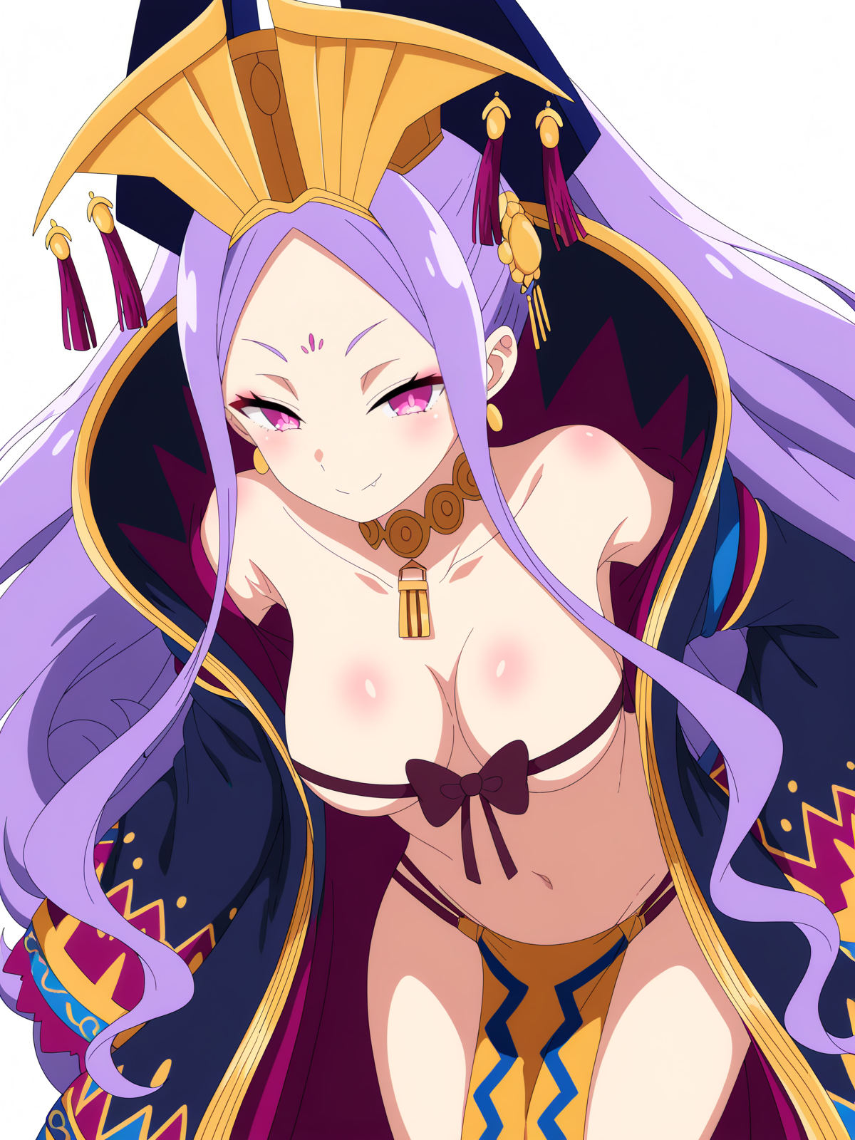 wu zetian \(fate\), wu zetian \(second ascension\) \(fate\), purple hair, long hair, twintails, parted bangs, forehead, forehead mark, purple eyes, crown, headdress, chinese clothes, hanfu, off shoulder, bow bra, revealing clothes, navel, loincloth, pelvic curtain, large breasts