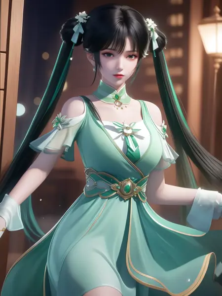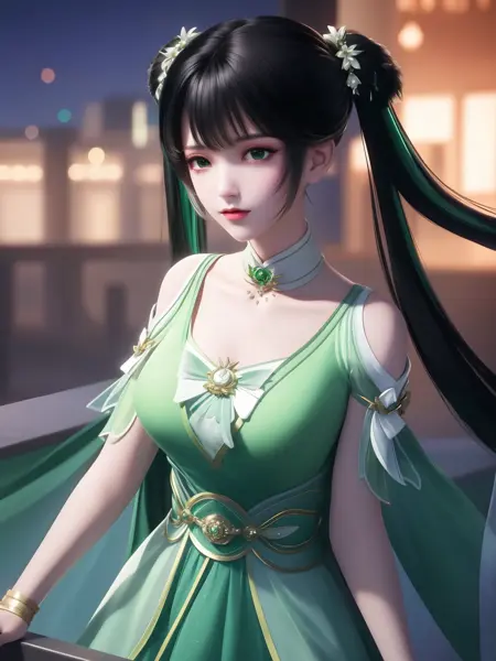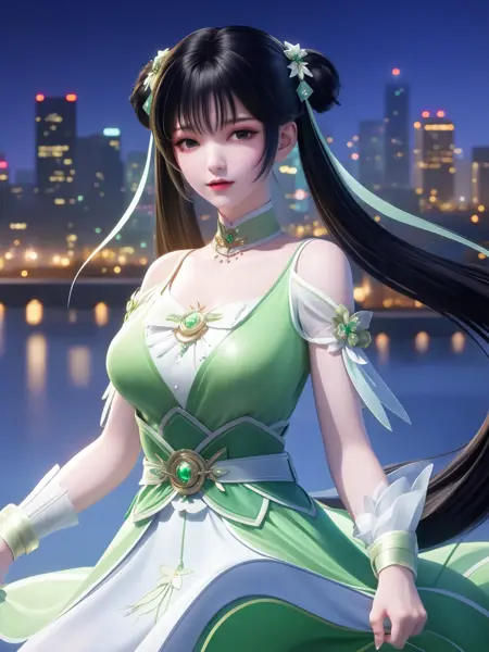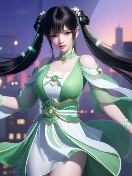 - ZXbiyao, 1girl, dress, solo,black hair, twintails, long hair, hair ornament,detached collar, wrist cuffs, cityscape, night, looking at viewer,