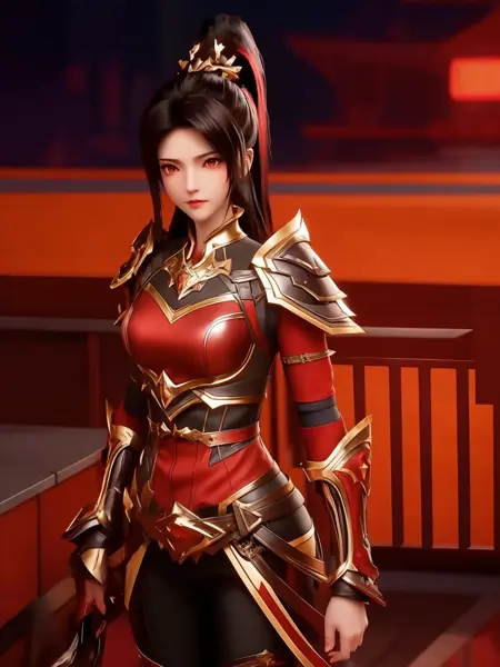 - SYWZwangyuanyuan,1girl, armor,cityscape, night, looking at viewer, mature female, red eyes,high ponytail, hair ornament, red shirt,cowboy shot, pauldrons,