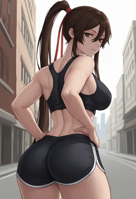 トリガー+外見: sag1ri, 長い髪, 茶色の髪, 目の間の髪, 横髪, 高いポニーテール, 髪リボン, 赤いリボン, 茶色の目