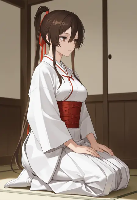 デフォルトの衣装: 和服, 白い着物, 赤い帯, 帯, 広い袖, 白い袴, 袴スカート