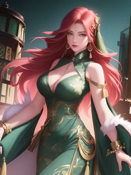 - 1girl, mature female, cityscape, night, looking at viewer, cowboy shot, hair ornament, WZRYhaiyueFMLY, jewelry, earrings, forehead mark, tassel earrings, beads, pear, green eyes, tassel, jade (gemstone), clothing cutout, bare shoulders, trim, sleeveless, bracelet, floral print, cleavage, feathers, coat,