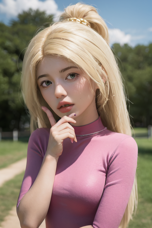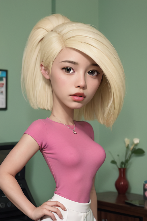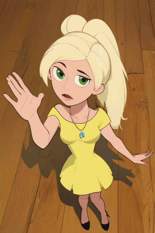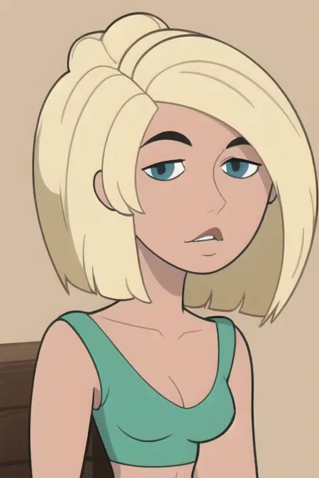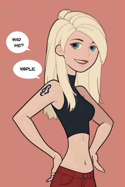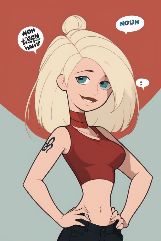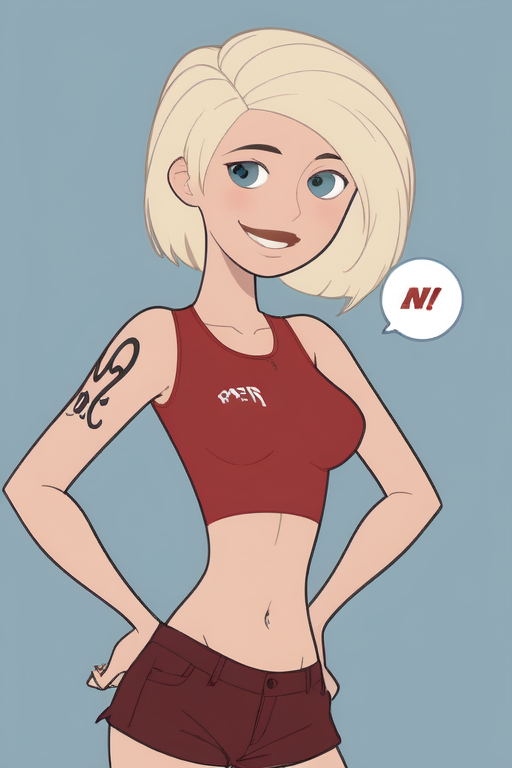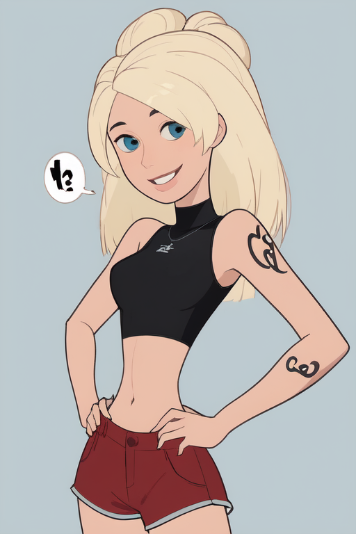 Cartoon female character with blonde hair and blue eyes. She's wearing a black crop top and red shorts. She has a tattoo on her left arm.