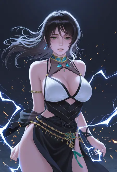 - elisesoutfit,过膝袜,裙子,胸部暴露,肚脐,项圈,珠宝,露腹,项链,黑色裙子,衬衫,大乳房,黑色过膝袜,无袖,侧乳,白衬衫,露脐装,蕾丝边,蕾丝镶边的腿部穿着,黑色鞋履,高跟鞋,迷你裙